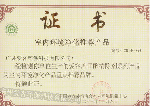 室內(nèi)環(huán)境凈化推薦產(chǎn)品榮譽證書